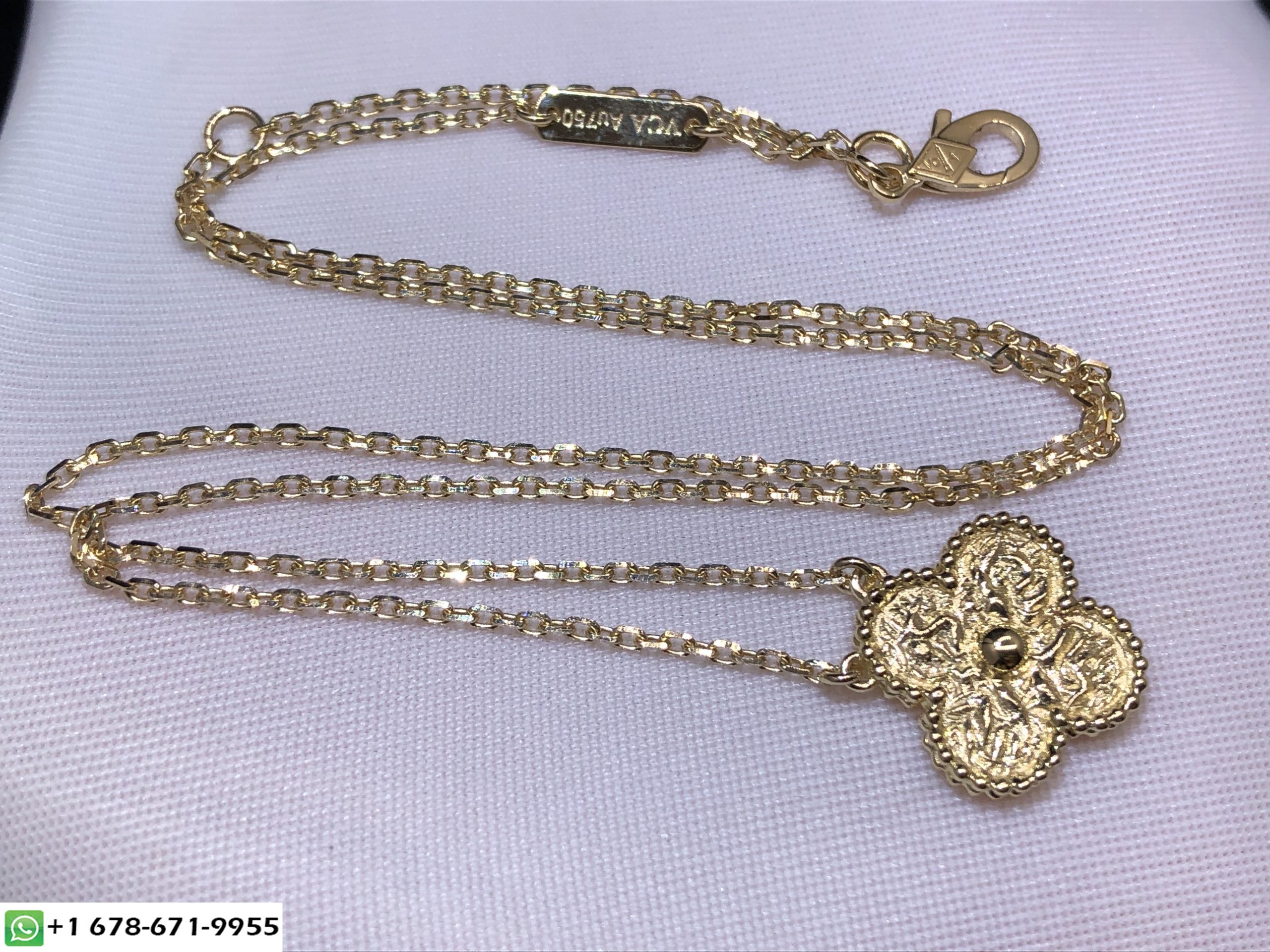 Van Cleef & Collier pendentif Vintage Alhambra Arpels réalisé sur mesure en or jaune 18 carats, fidèle au tout premier bijou Alhambra® créé en 1968, les créations Vintage Alhambra de Van Cleef & Les arpels se distinguent par leur, élégance intemporelle. Inspiré de la feuille de trèfle, ces icônes de chance sont ornées d'une bordure de perles dorées.