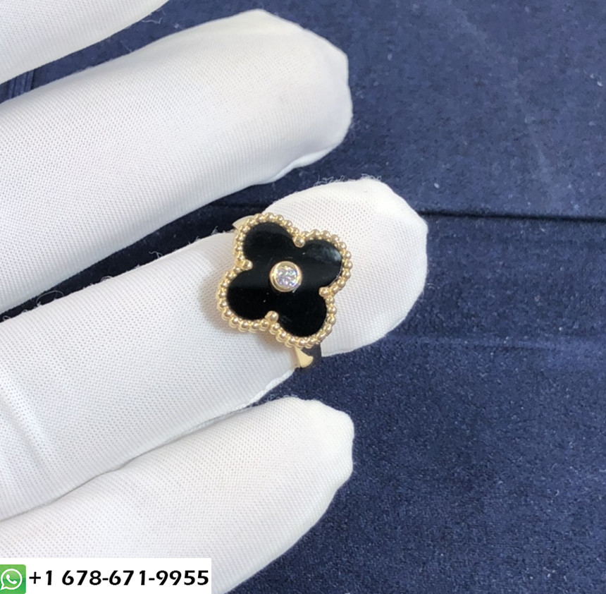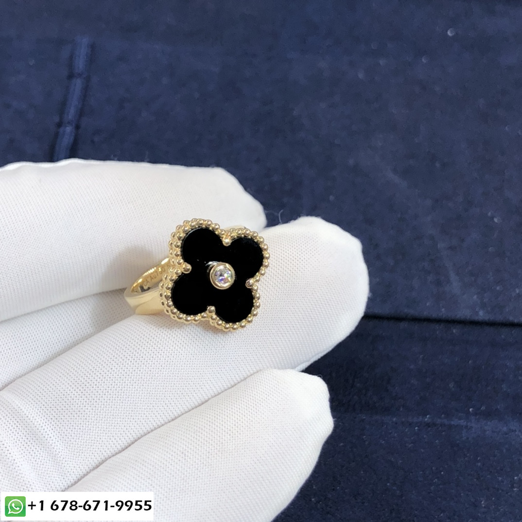 De cleef & bague arpels vintage alhambra sur mesure fait en or jaune 18 carats,onyx serti d'un diamant totalisant 0.06 Cette bague VCA est également disponible en or rose 18 carats et en or blanc 18 carats sur demande.