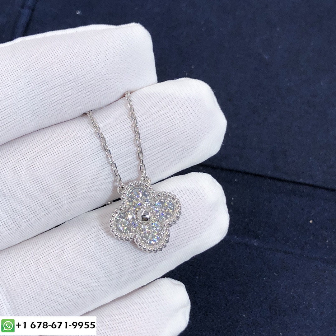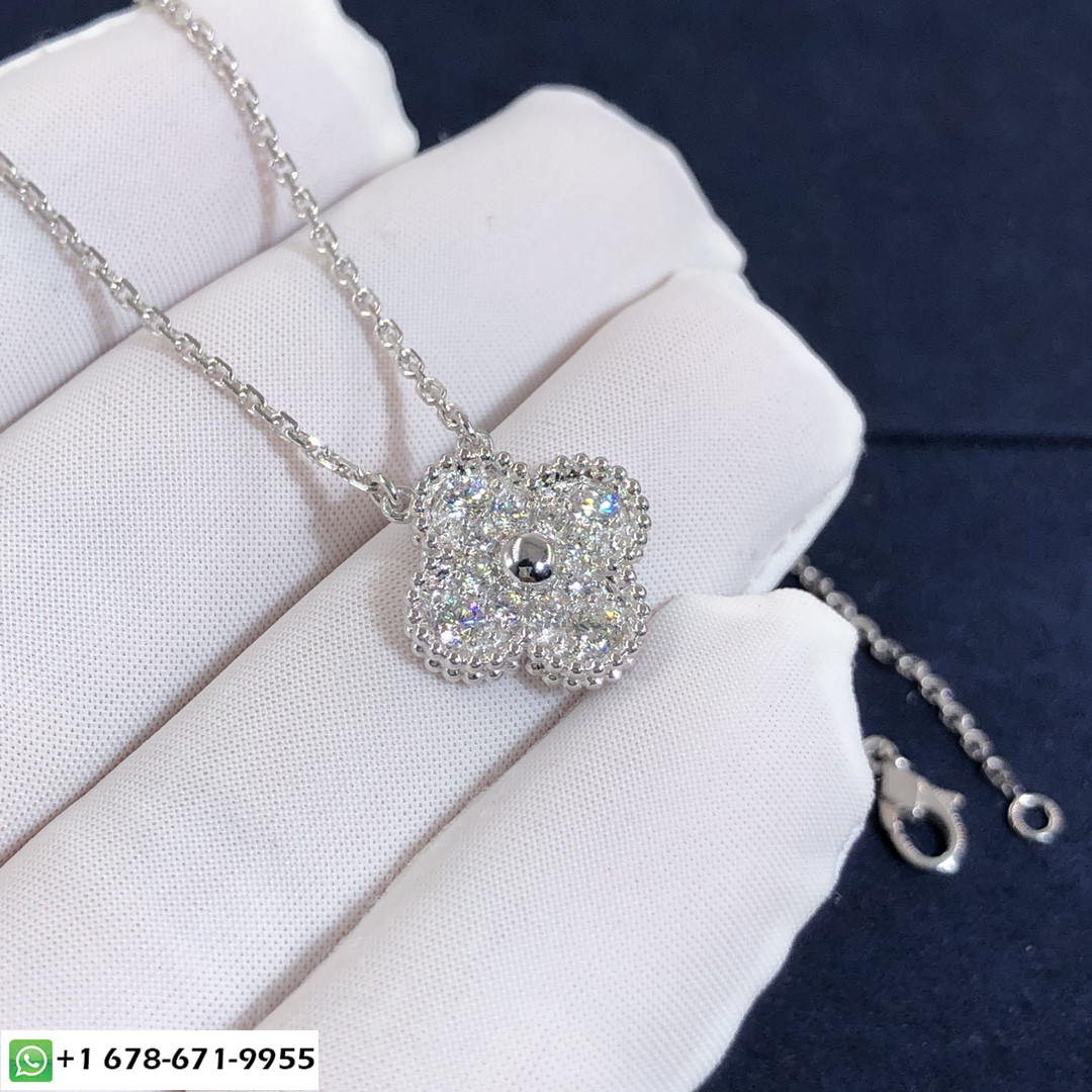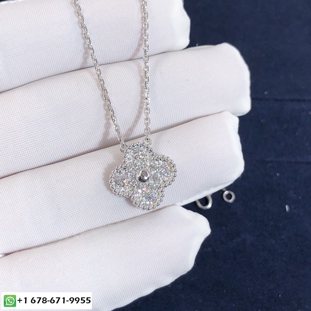 Pendentif VCA Sweet Alhambra personnalisé fait en or blanc 18 carats serti de 12 diamants ronds totalisant 0.08 ct.Longueur de la chaîne: 40 cm.Ce Van Cleef & Le pendentif Arpels Sweet Alhambra est également disponible en or rose 18 carats et en or jaune 18 carats sur demande. & Les arpels présentent de délicieux motifs porte-bonheur sous forme miniature depuis 2007. Léger et délicat, ils sont une manière discrète d'apporter du bonheur à chaque jour qui passe.