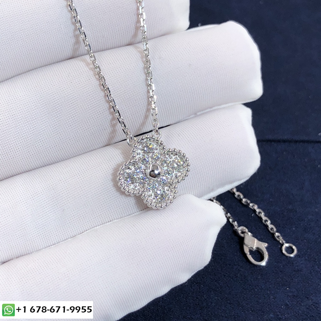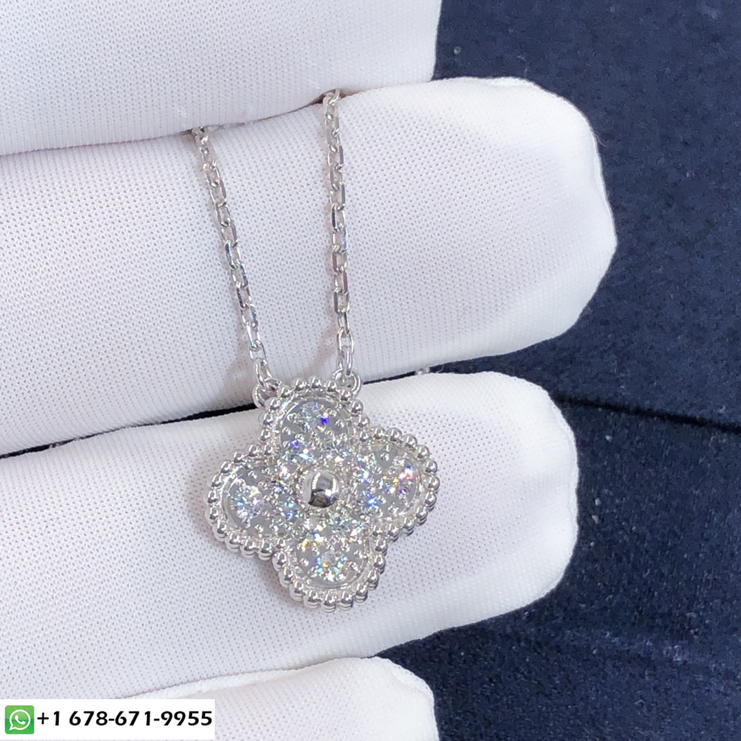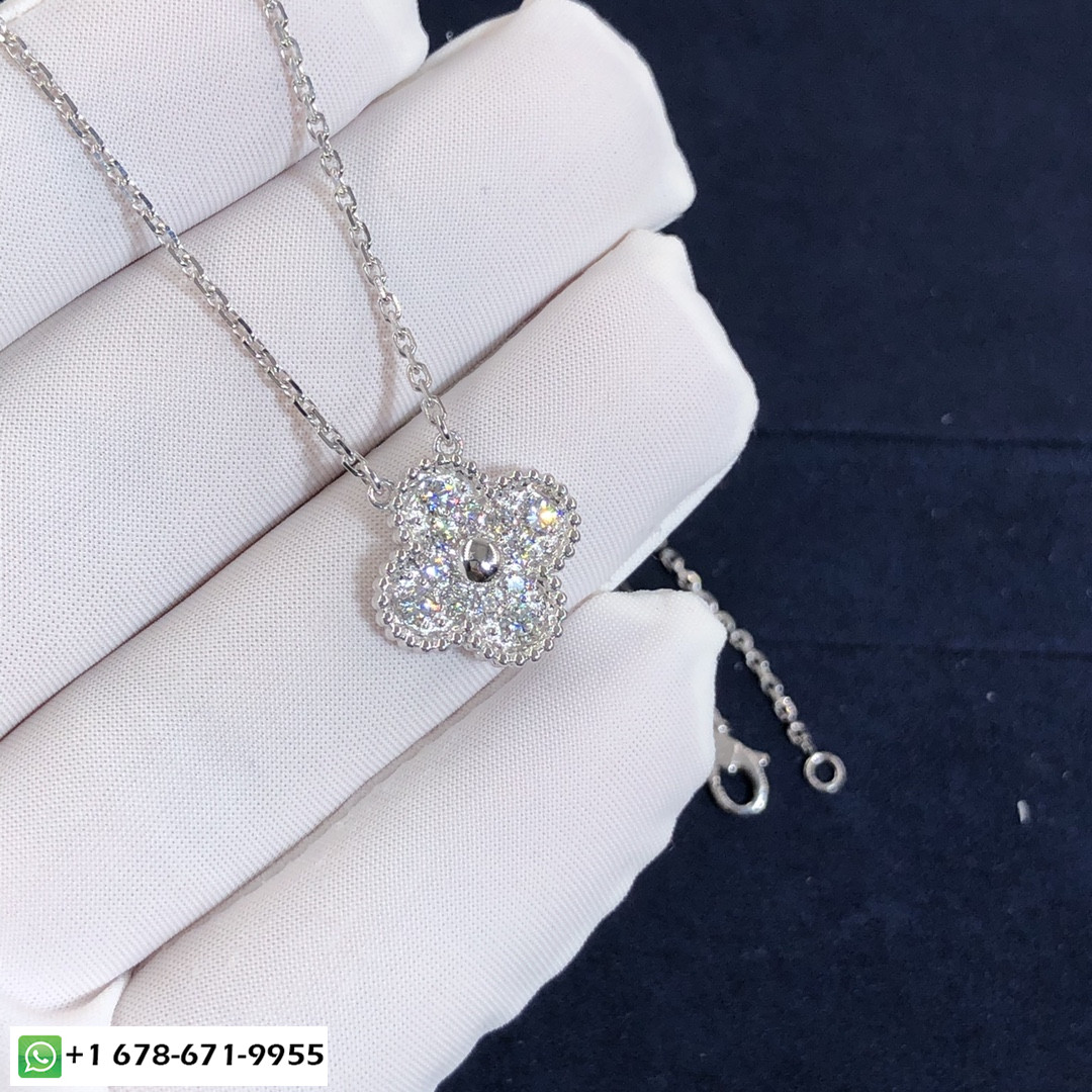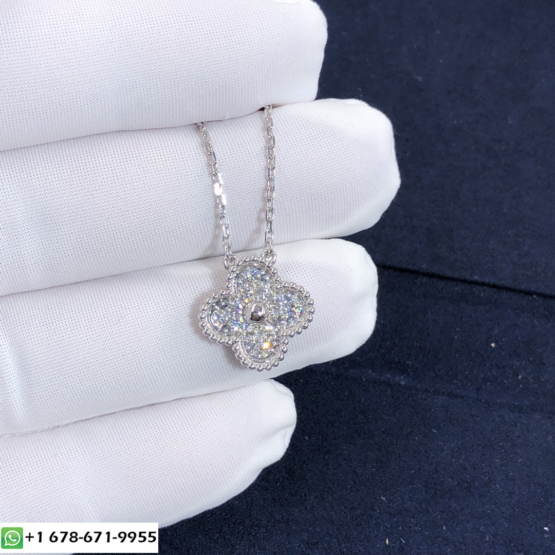 Pendentif VCA Sweet Alhambra personnalisé fait en or blanc 18 carats serti de 12 diamants ronds totalisant 0.08 ct.Longueur de la chaîne: 40 cm.Ce Van Cleef & Le pendentif Arpels Sweet Alhambra est également disponible en or rose 18 carats et en or jaune 18 carats sur demande. & Les arpels présentent de délicieux motifs porte-bonheur sous forme miniature depuis 2007. Léger et délicat, ils sont une manière discrète d'apporter du bonheur à chaque jour qui passe.