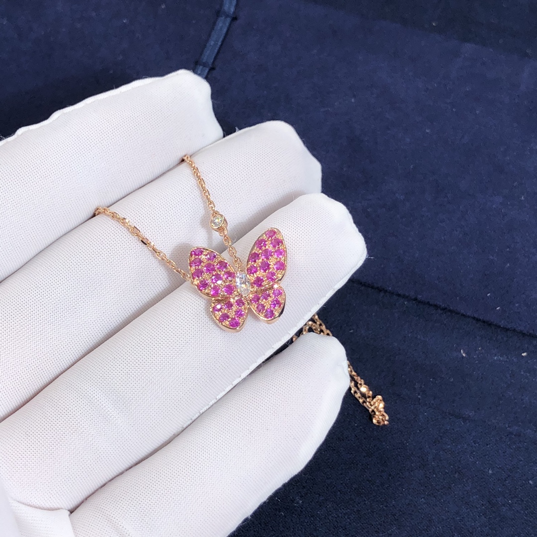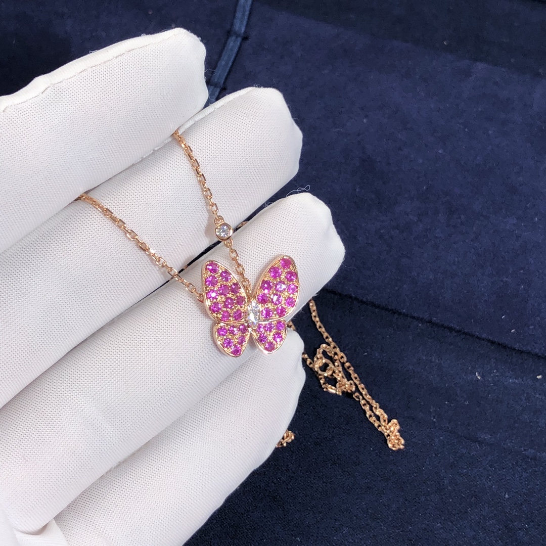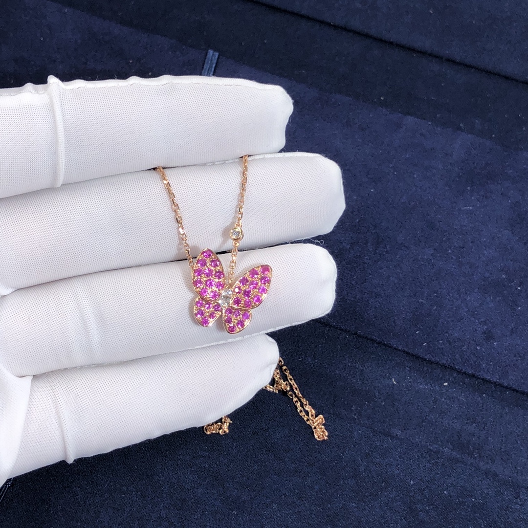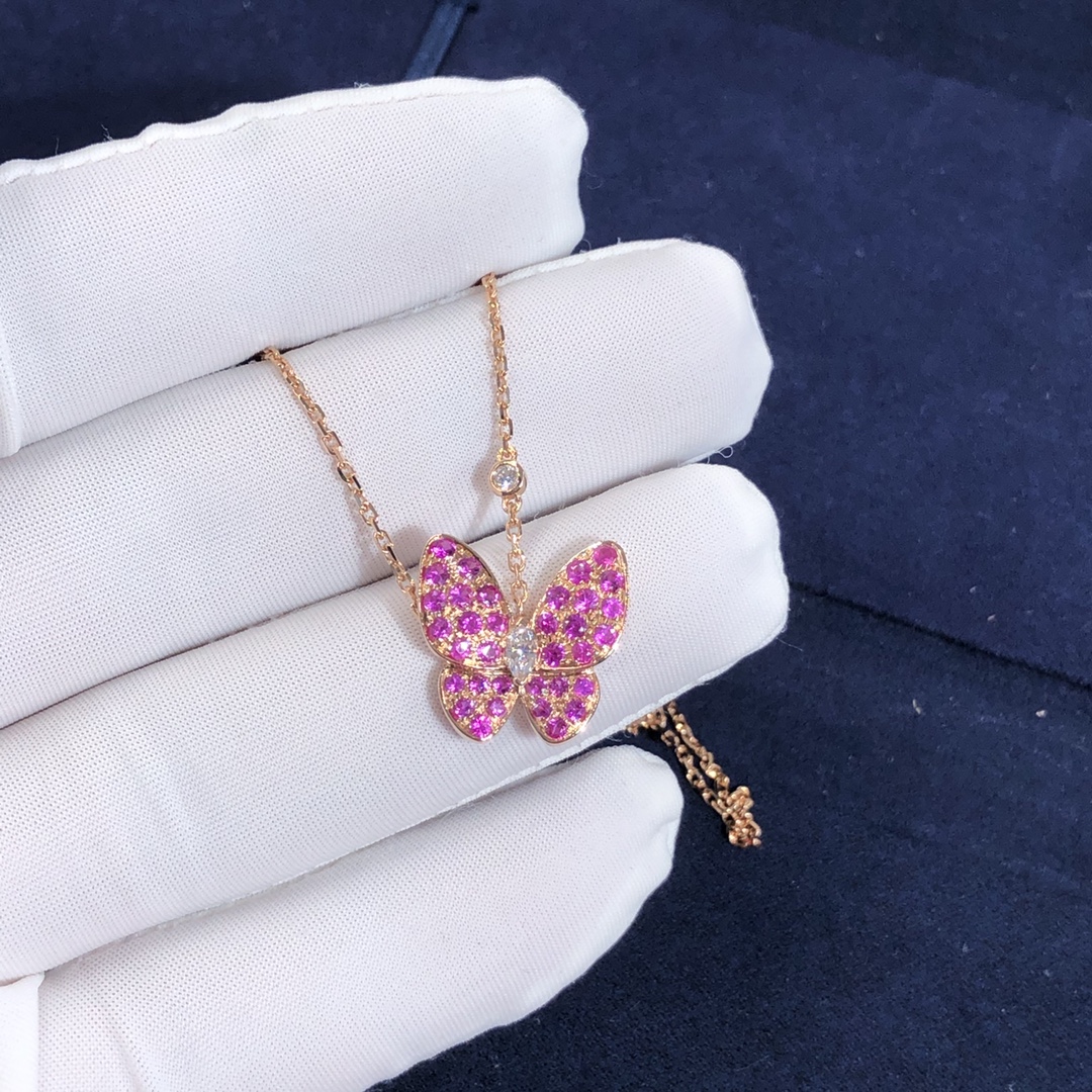 VCA deux pendentif papillon fait sur mesure en or rose 18 carats,34 saphirs roses ronds totalisant 0.88 ct,2 diamants ronds et taille marquise totalisant 0.2 ct Longueur de la chaîne: 42 cm. van cleef & arpels pendant est également disponible en or jaune 18 carats et en or blanc 18 carats sur demande. & Arpels revisite l'un de ses thèmes les plus précieux dans la collection de bijoux Two Butterfly. Ces pièces éblouissantes combinent couleur et asymétrie pour réinterpréter la grâce et la beauté des papillons en vol.